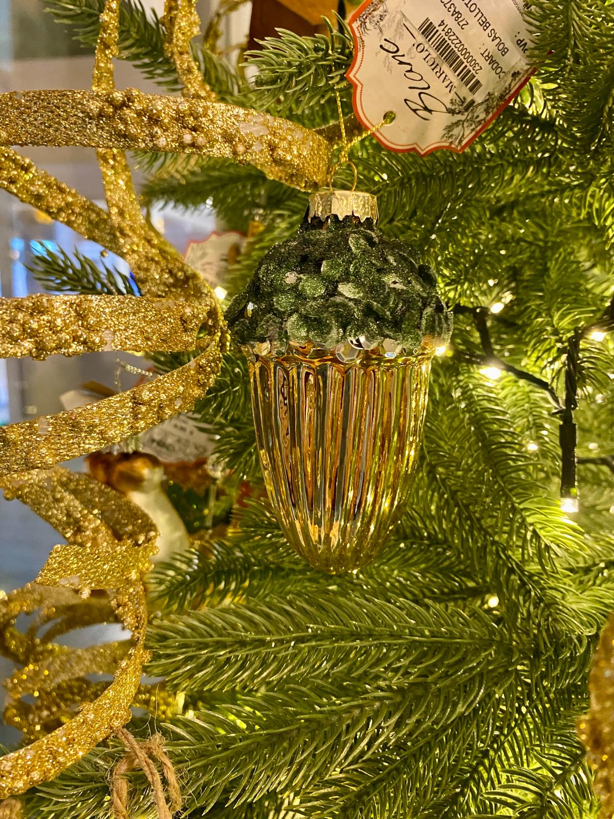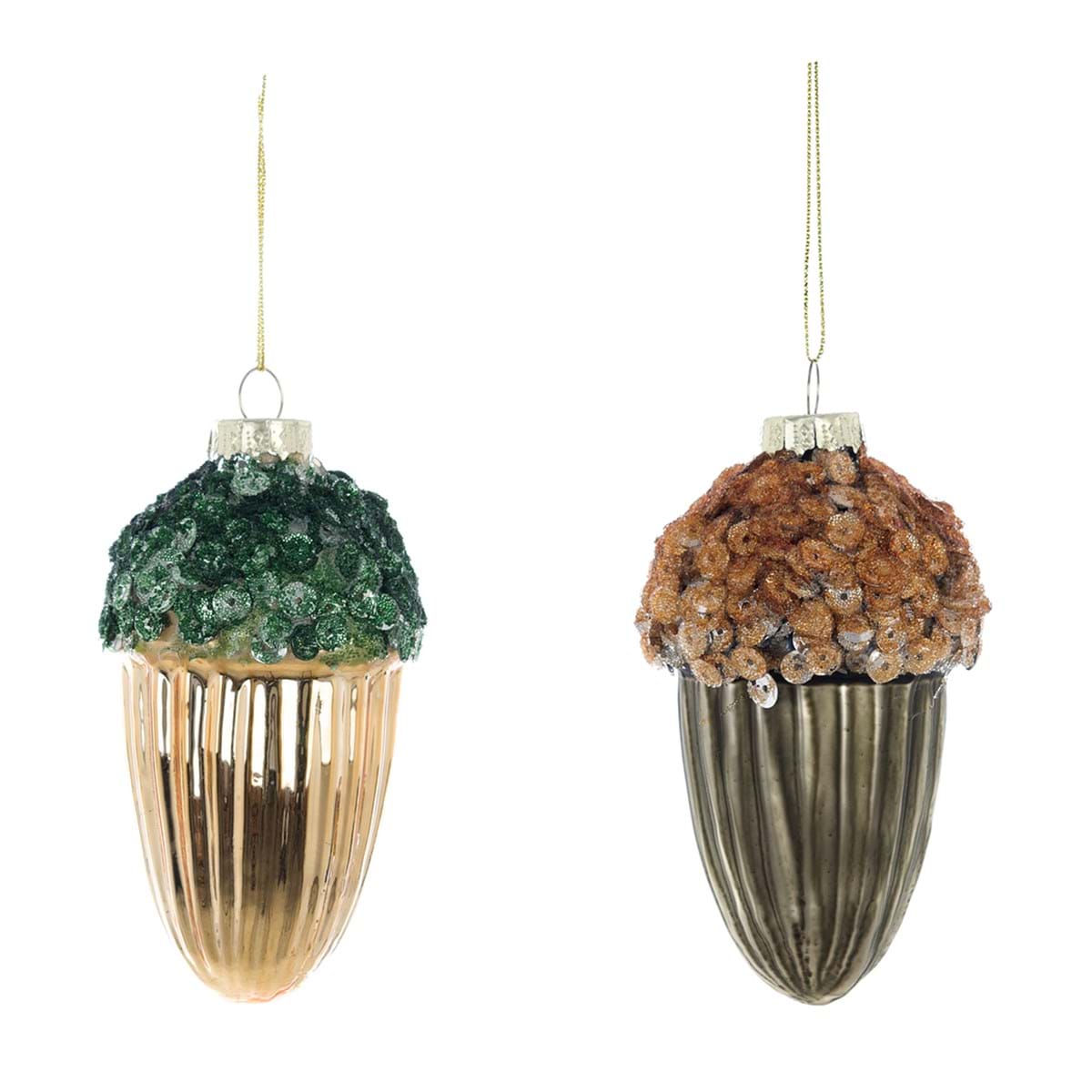Colgante navidad bellota de cristal, 2 colores . Medida: 6 cm de diámetro y 10 cm de altura. Contenido : 1 pieza.