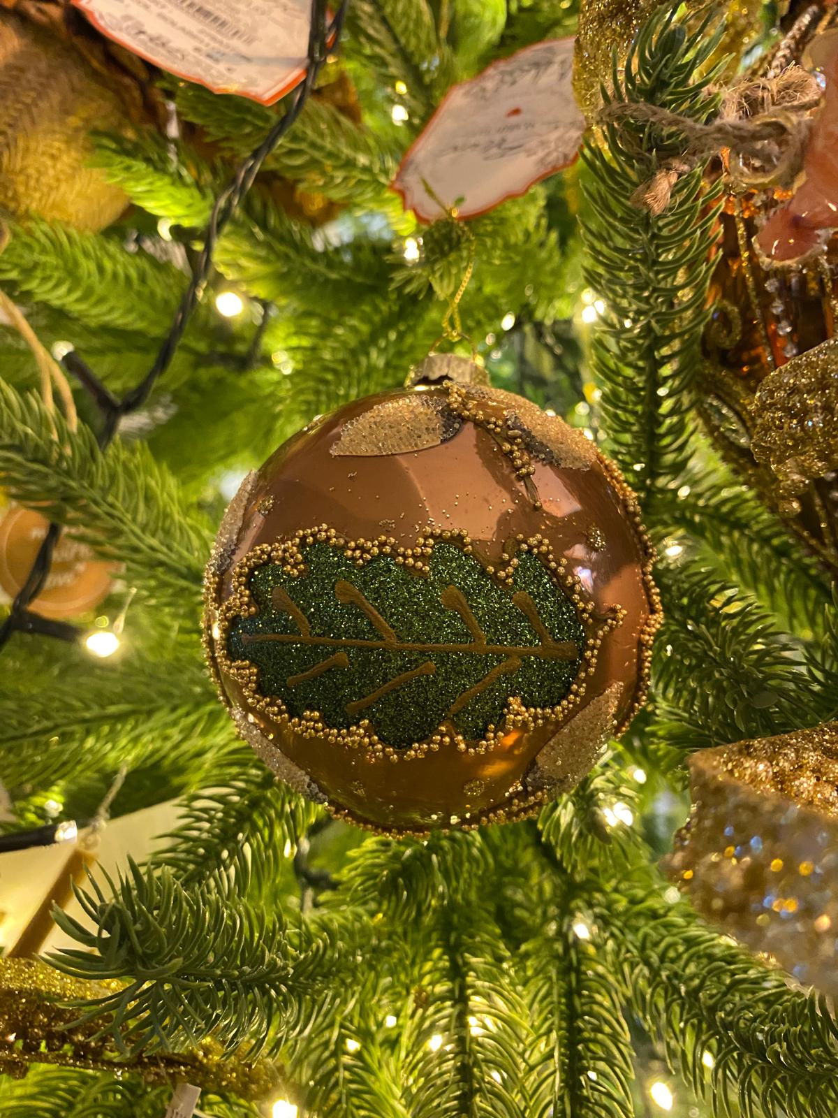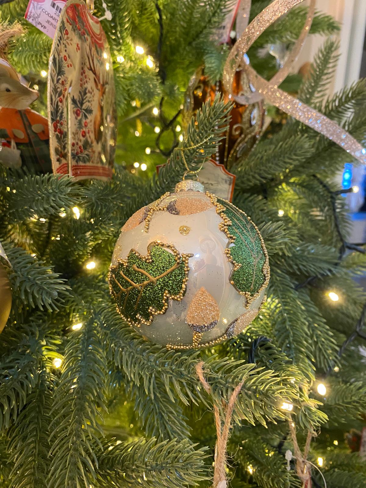 Colgante bola de navidad de 8 cm de diámetro decorada con hojas y bellotas en relieve, con detalles brillantes,3 modelos. Contenido: 1 pieza.
