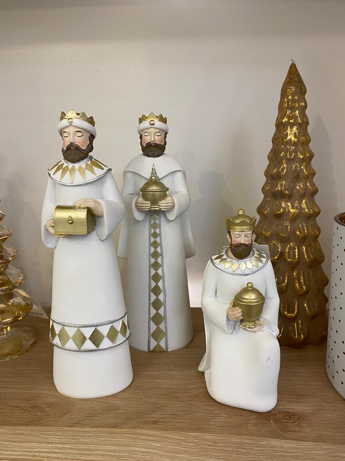Conjunto de 3 piezas figuras reyes magos, material poliresina. Medida : 8 cm de ancho y 25 cm de altura.