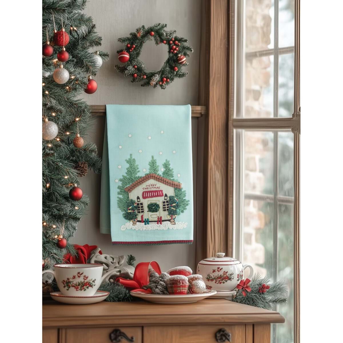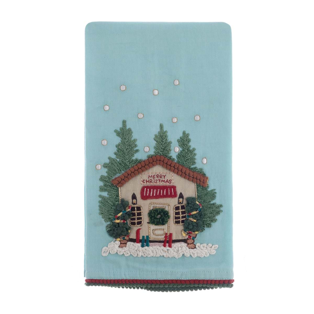 Paño de cocina azul claro  de algodón 100% con bordado tridimensional de casita navideña, pinos y copos de nieve, bordes recortados, Medida : 40x70cm