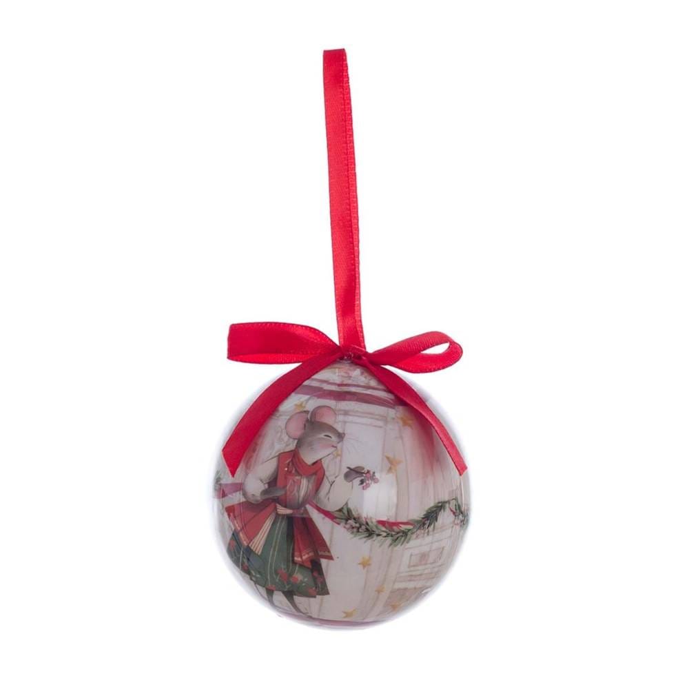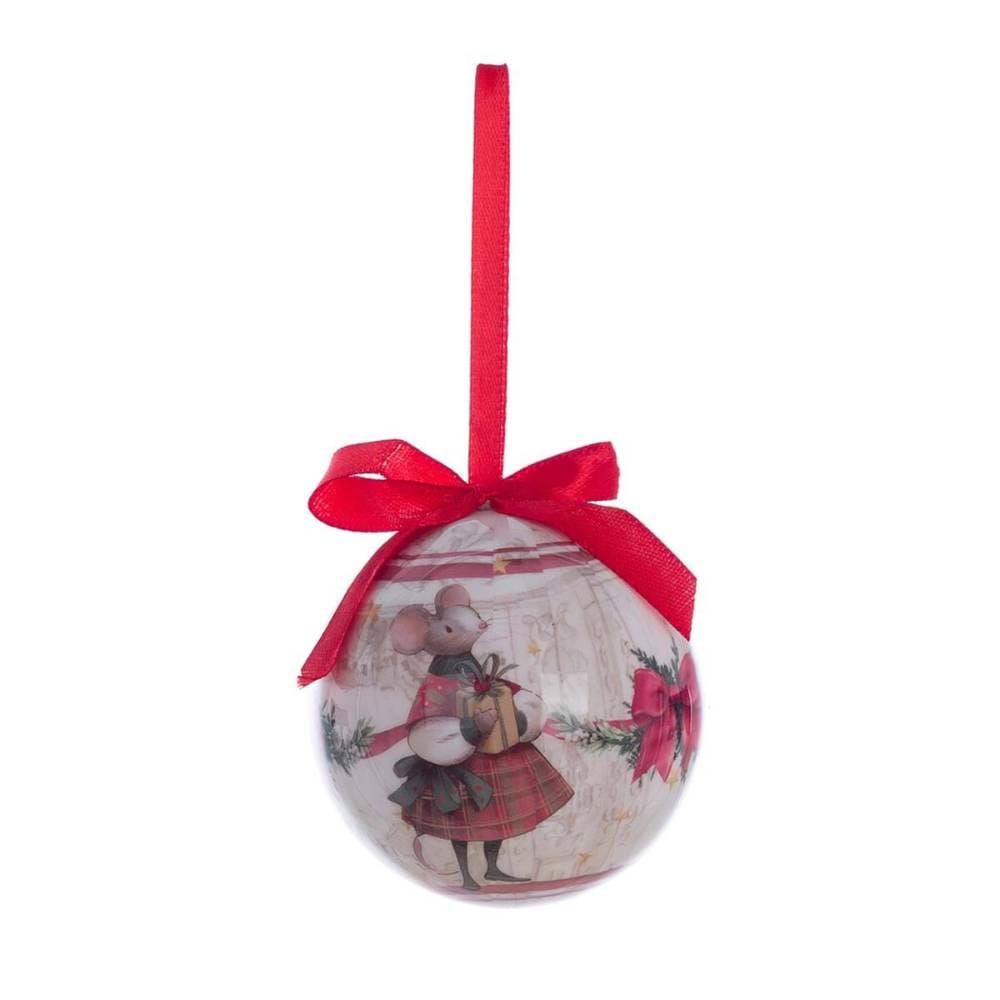 Set de 5 esferas  de poliestireno decoradas con ratones y árboles de Navidad de  7,5 cm de diámetro , en caja octogonal con lazos rojos y bordes temáticos de 19 cm de largo , 19 cm de ancho y 8 cm de alto.